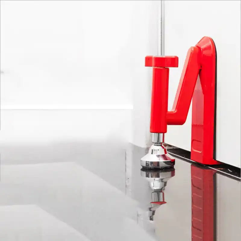 The innovative hinge and angle system anchors the lock firmly to the floor when external pressure is applied to the door. The adjustable foot, located at the end of the hinged foot, allows the lock to be installed on any type of floor: flat or sloping.